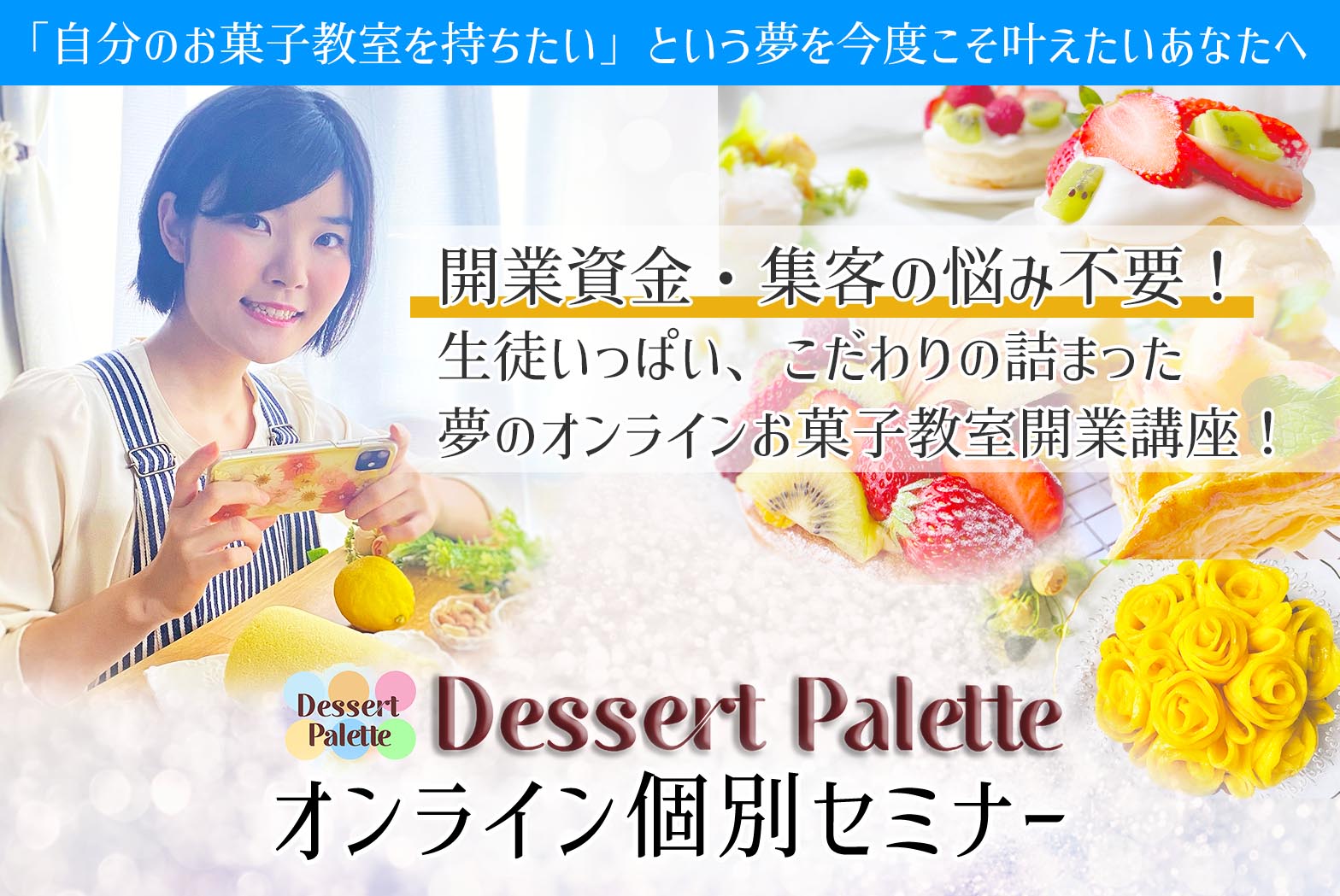 オンライン個別セミナーは、オンラインお菓子教室を開催し、大好きなお菓子作りを教えることで、お客様に笑顔を届け、感謝される先生になっていくための方法をお話しし、サポートを受けながら進めていくスクールのご案内と合わせて、参加者お一人おひとりにあわせた進め方についてご相談にのっていきます。