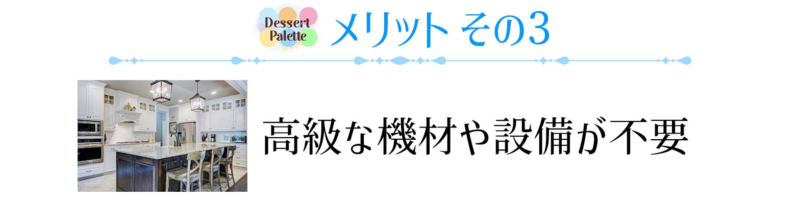 オンラインでのお菓子教室は、お菓子屋さんでもなければ、自宅に集まって開催するわけでもありません。ですので、高級な機材や設備が不要で、初期費用がかかりません。
